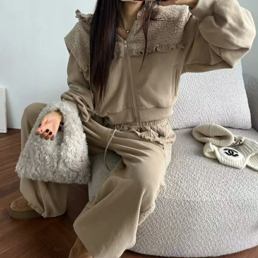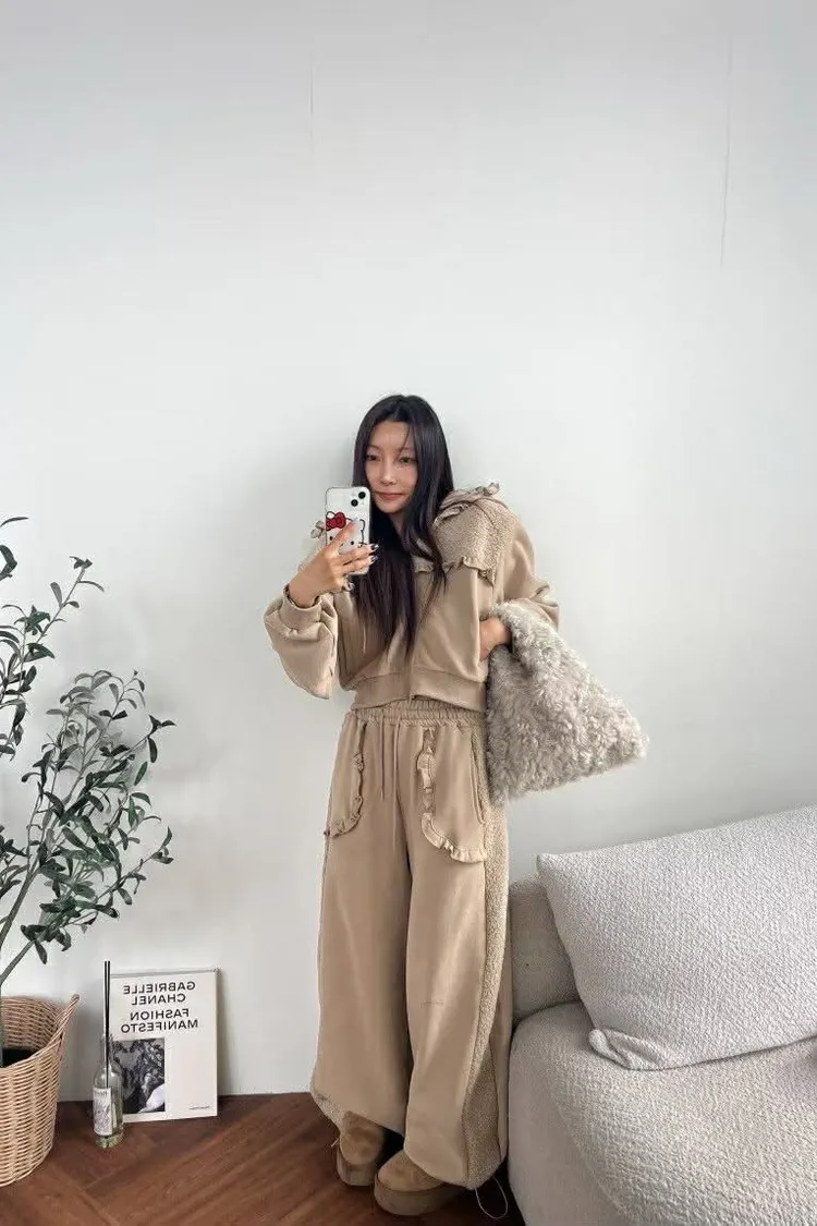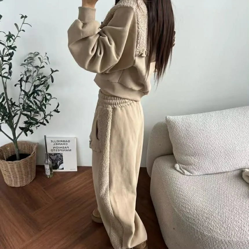 『羔羊絨異材質拼接內刷毛口袋設計下抽繩棉褲』
