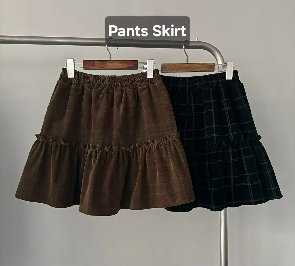 『薄款燈芯絨格子蛋糕式褲裙』