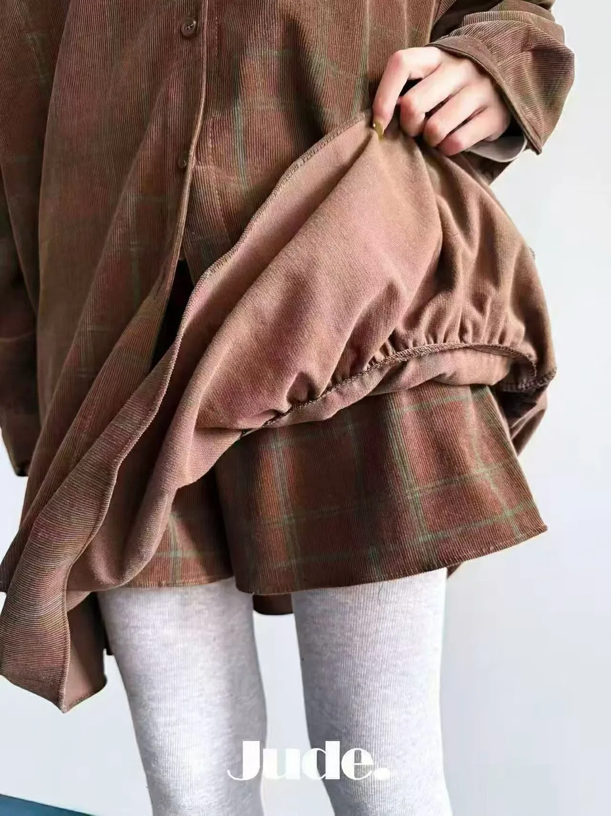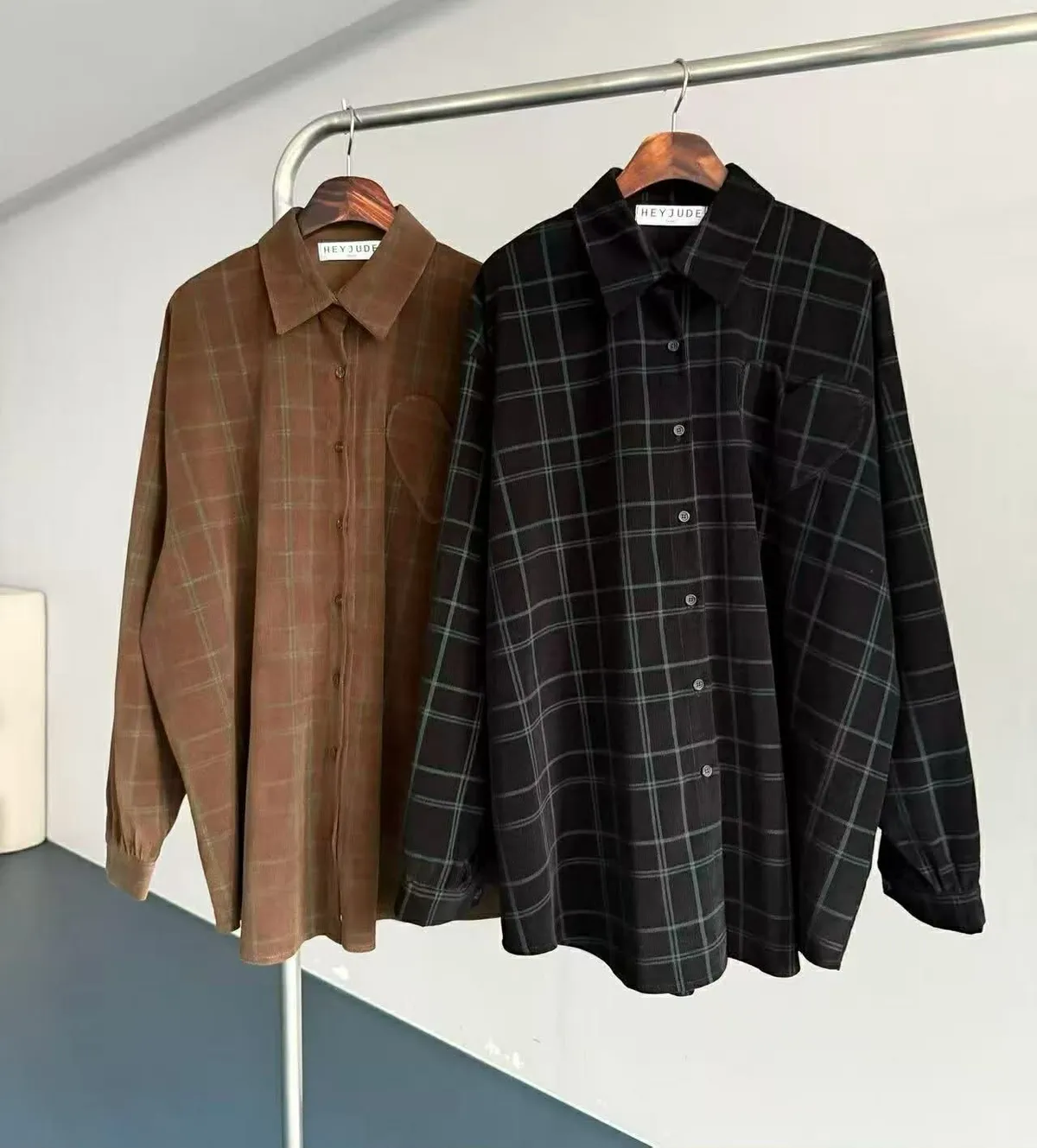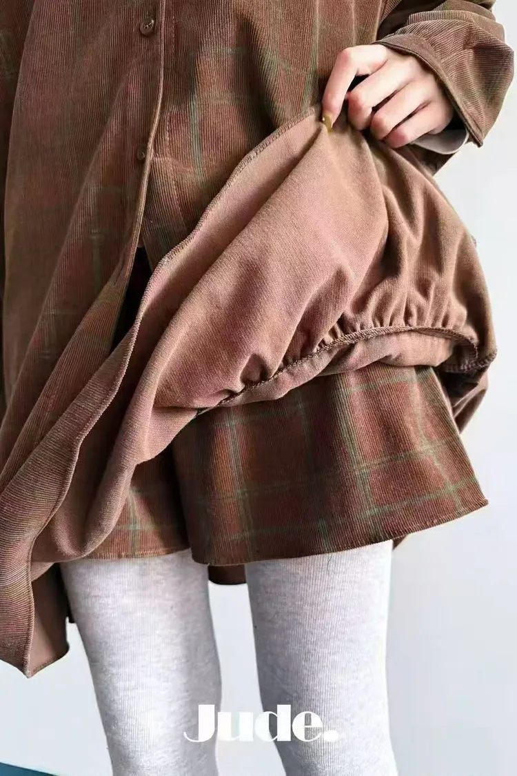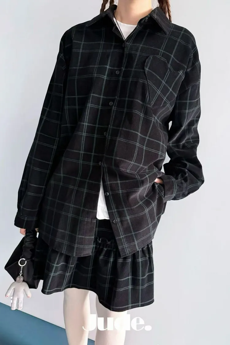 『薄款燈芯絨格子愛心口袋over size 襯衫』